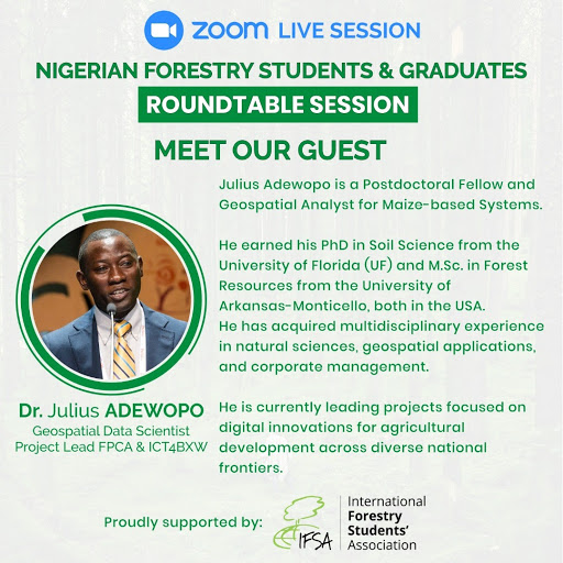 Dr. Julius Adewopo is very concerned about the future of the Forestry profession in Nigeria and the world at large as well as the organizer of the Nigeria Forestry Students and Graduates Roundtable Session – Meshach Aderele and Olaoluwa Israel Adetula. He has agreed to speak to Forestry Students in Nigeria once more via Zoom by this weekend on Saturday 6 June 2020 by 1pm GMT+1.