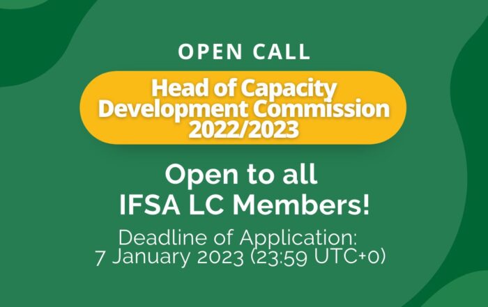 Dear IFSA World, IFSA wishes to announce that the position for Head of Capacity Development Commission (CDC) is vacant. This is a call to enthusiastic and self-motivated individuals who will serve for the 2022/23 [...]