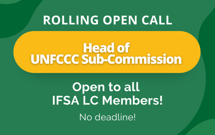Open call - HoSC UNFCCC (Closed) Dear IFSA Family, Would you like to become involved with what happens in IFSA? A new opportunity is here. The official position for the Head of the UNFCCC [...]