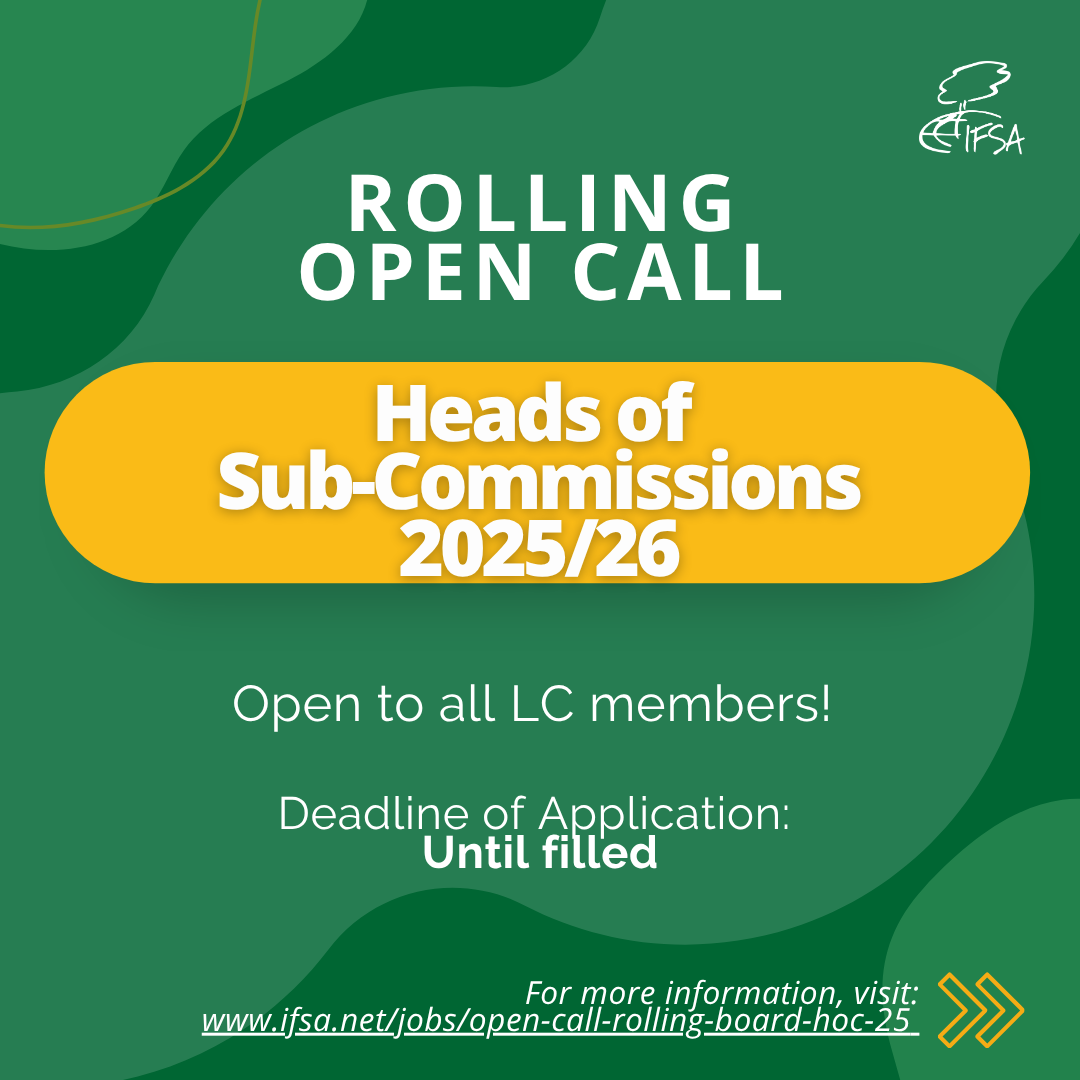 IFSA Officials volunteer to contribute to the IFSA Network. This can take many forms: from being the FAO representative for IFSA members, to exploring your creative side in designing for social media, to connecting with the Local Committees in your region and helping them engage in international IFSA activities and cross-national meetings. Whether you are interested in communication, capacity development, or policy, IFSA offers a wide range of opportunities.